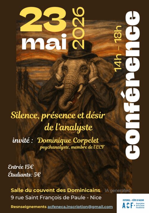 Dans le cadre du Séminaire des échanges de l’ACF en ECA, Dominique Corpelet exposera une conférence sur le thème du désir, de la présence et du silence de l’analyste.