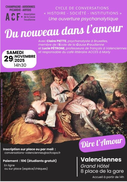 L’ACF-CAPA à Valenciennes propose : le « cycle de conversations : Histoire – Société – Institutions. Une ouverture psychanalytique ». Un thème par cycle avec trois conversations. Des thèmes variés allant de l’enseignement, aux modalités de l’amour et de la rencontre, en passant par la médecine, le soin, les affects, l’histoire et la répétition, le réel de la guerre, … Autant de sujets en lien avec l’actualité, l’histoire, l’évolution de notre société et des instituions auxquelles nous sommes rattachés, la première étant la famille. L’actualité – aux couleurs parfois d’inquiétante étrangeté – sera revisitée et interrogée avec quelques-uns en prise directe dans la clinique avec ces thèmes. L’appui sur le discours analytique laissera place à une ouverture face à l’impasse. A qui s’adressent ces conversations ? A tout professionnel de l’enseignement, du soin, du médico-psycho-social, mais aussi à tout citoyen, parent, étudiant, artiste, retraité … toute perso nne intéressée à ce qui fait écho dans l’actualité. Premier cycle de septembre 2025 à juin 2026 : « Du nouveau dans l’amour. Dire l’amour. » La première conversation aura lieu le samedi 29 novembre 2025 en présence de Claire PIETTE, psychanalyste, membre de l’Ecole de la Cause Freudienne et de Lucie PÉTRONE, professeure de français à Valenciennes et responsable du café littéraire ACCES à Marly. Nous converserons autour de l’enseignement de l’amour aux collégiens, puisqu’au programme, à partir de la poésie lyrique. Nous entendrons comment un atelier de poésie peut ouvrir un espace de respiration à des jeunes touchés par la dureté de la vie. L’amour des mots chez Michel Leiris sera au rendez-vous, sans oublier l’amour de transfert vu par Freud et Lacan, menant au bien-dire, au désir de savoir, au surgissement d’un nouveau désir et d’un nouvel amour de la vie. Nous serons accueillis dans un des salons du Grand hôtel art-déco de Valenciennes. Pour cette première conversation : une petite surprise musicale, dire l’amour en chantant.