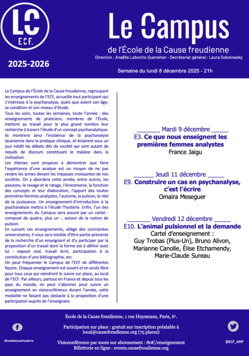 Vendredi 12 décembre – E10 – L’animal pulsionnel et la demande, Cartel d’enseignement : Guy Trobas (Plus-Un), Bruno Alivon, Marianne Canolle, Élise Etchamendy, Marie-Claude Sureau