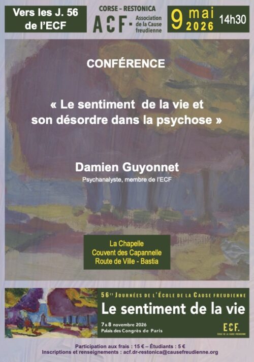 L’ACF en Corse vous propose une après-midi préparatoire aux J56 de l’ECF avec une conférence de Damien Guyonnet, psychanalyste, membre de l’ECF, dont le titre est « Le sentiment de la vie et son désordre dans la psychose ».