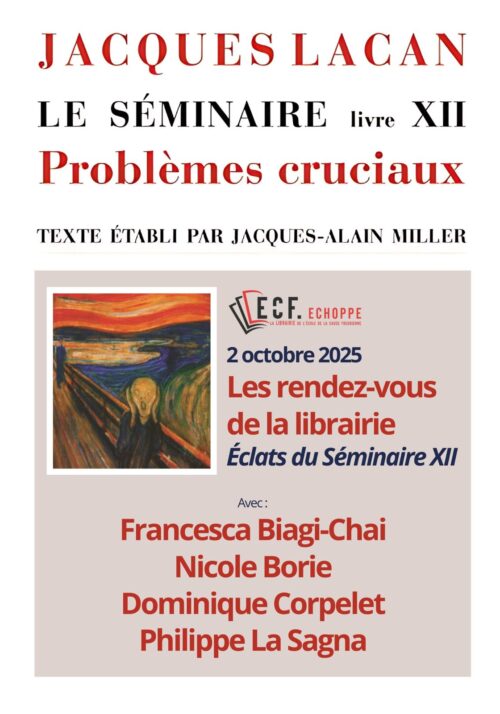 Un cri, Munch. De Vulgari eloquentia, Dante. Merde, Dostoïevski. Seule à cinq heures, un linguiste. Les rendez-vous de la librairie se poursuivent à la rentrée avec quatre invités à partir de ces éclats extraits du Séminaire Problèmes cruciaux pour la psychanalyse. Le peintre par Dominique Corpelet, l’italien par Philippe La Sagna, le russe par Francesca Biagi-Chai et une femme par Nicole Borie.