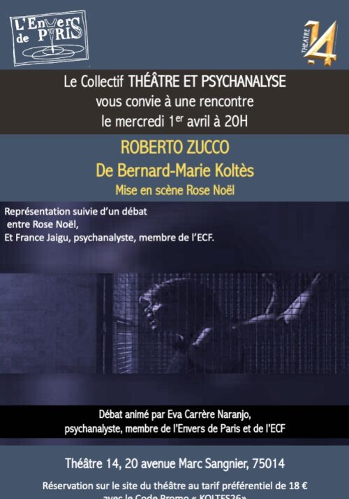 Le vecteur Théâtre et psychanalyse vous convie à une rencontre le mercredi 1er avril à 20h au Théâtre 14, après la représentation de « Roberto Zucco » de Bernard-Marie Koltès, mis en scène par Rose Noël. France Jaigu a accepté d’être notre invitée.